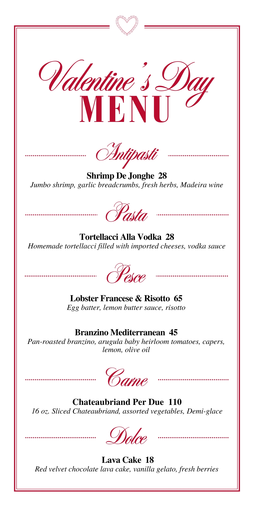 Order from our signature Valentine’s Day Menu, available Friday the 13th and Saturday the 14th, or from our regular menu.